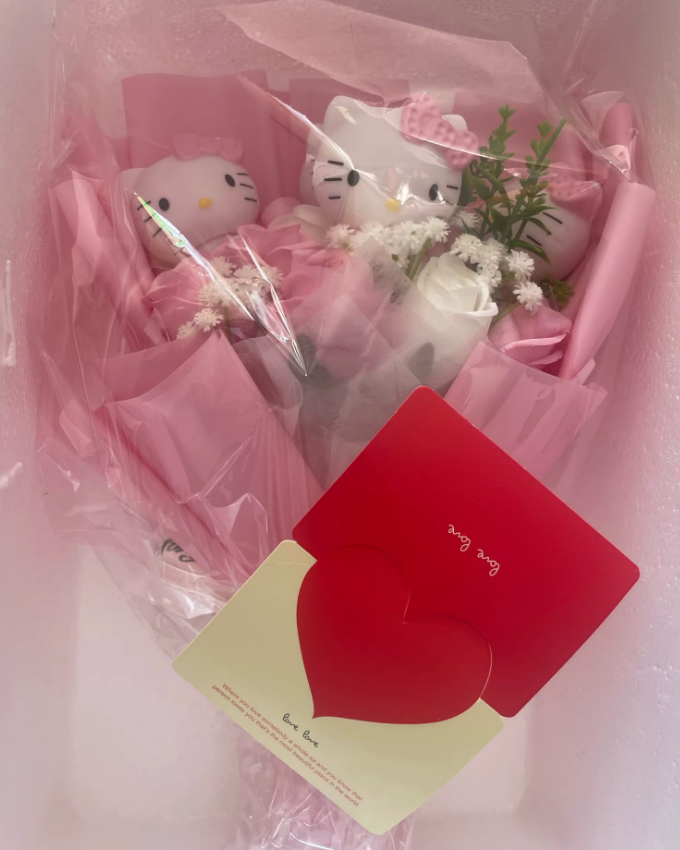 „Bukiet z Hello Kitty wygląda pięknie na moim biurku 💖.”